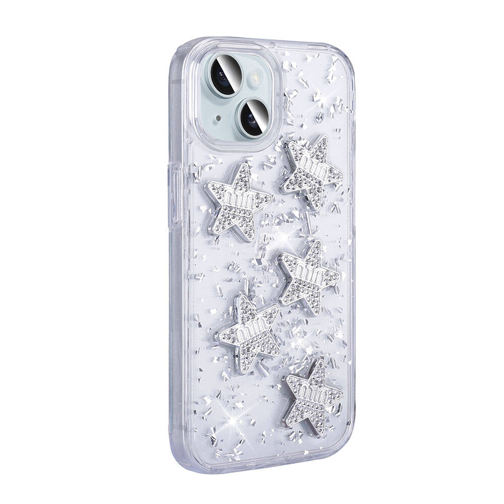 Kalp, yıldız ve fiyonk şekilleriyle birlikte simli tasarım, parıltılı şık arka yüzey yapısı.