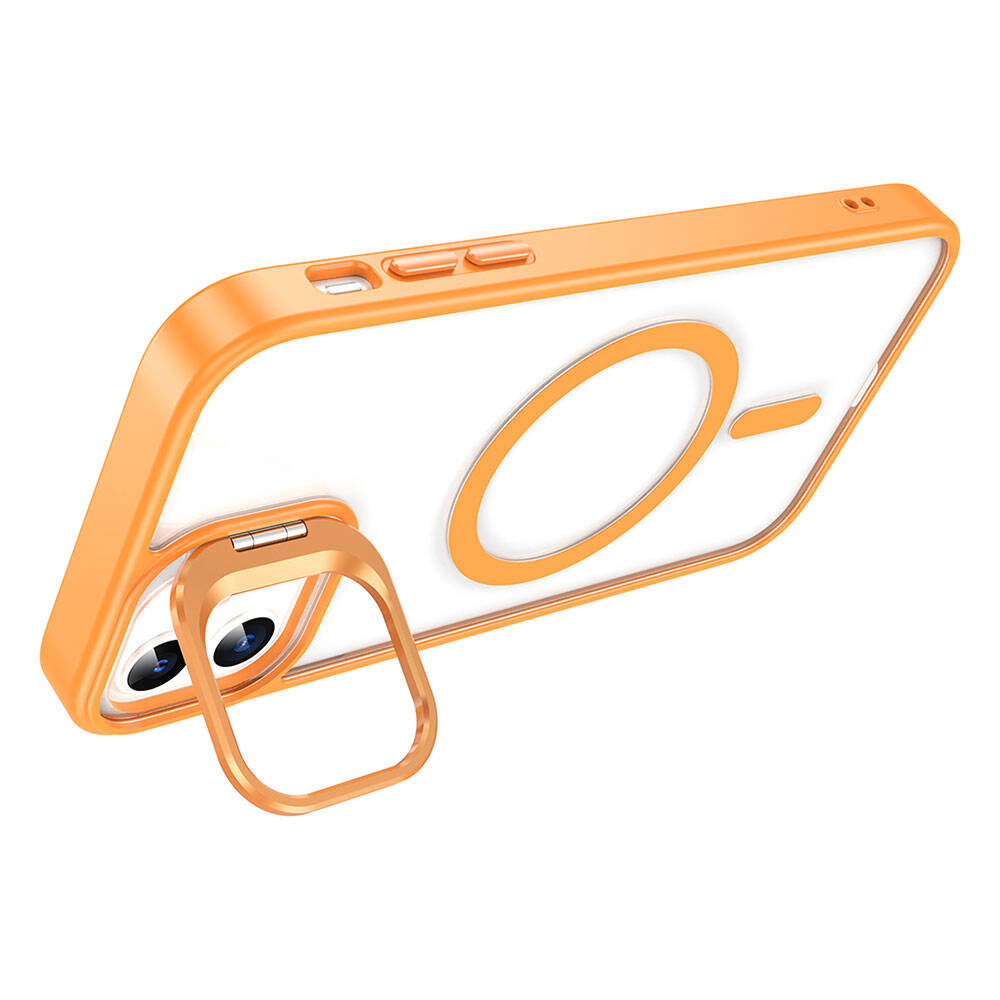 Apple iPhone 15 Kılıf Magsafe Şarj Özellikli Standlı Zore Magsafe Klon Lensli Kapak Turuncu