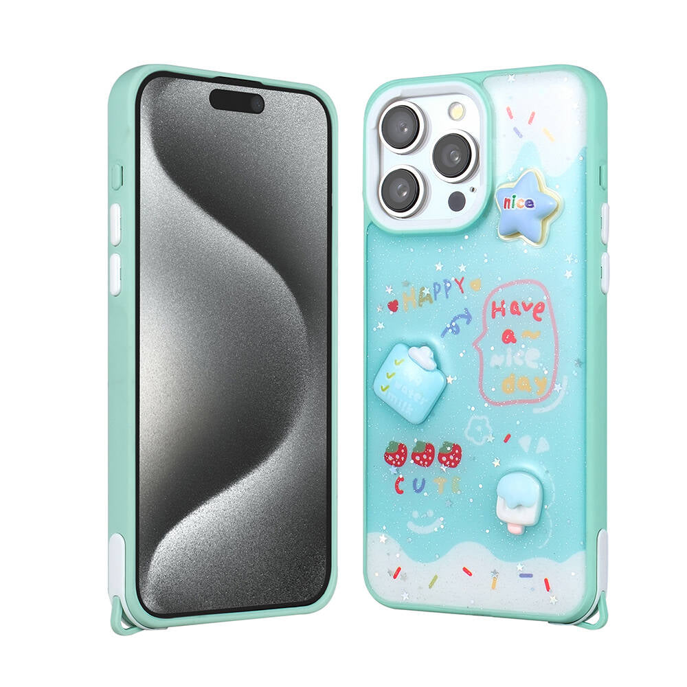 Apple iPhone 15 Pro Max Kılıf Parlayan Simli Kabartma Figürlü Zore Cevze Kapak Yeşil